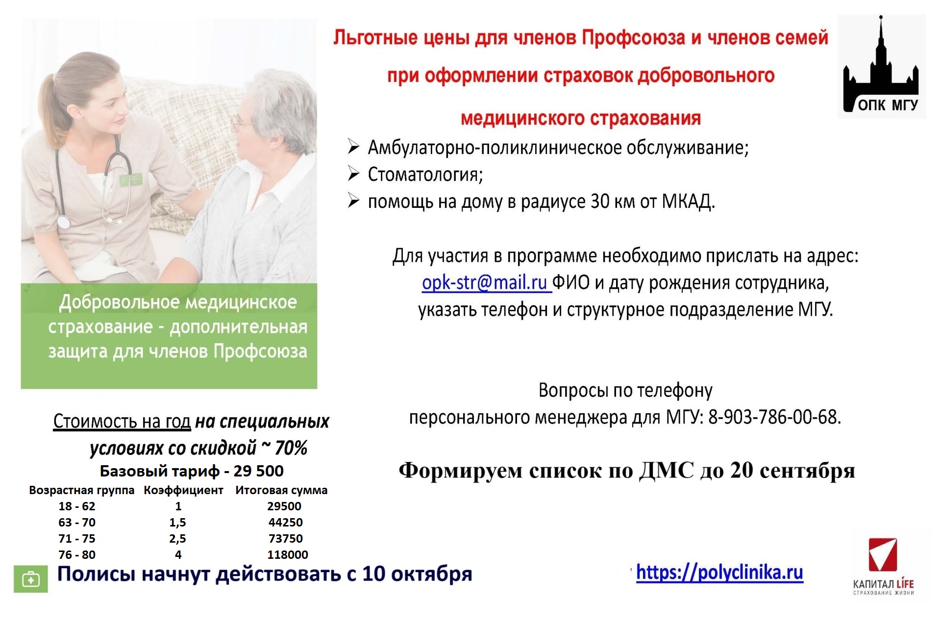 • Полисы страхования по программе Добровольного медицинского страхования (ДМС) на базе клиник «Поликлиника.РУ»: Начало действия программы — 10 октября 2025 года, длительность программы — 1 год; срок подачи заявлений на участие и оплата льготной стоимости — до 20 сентября 2025 г.; Базовая стоимость годового полиса — 29500 рублей.
